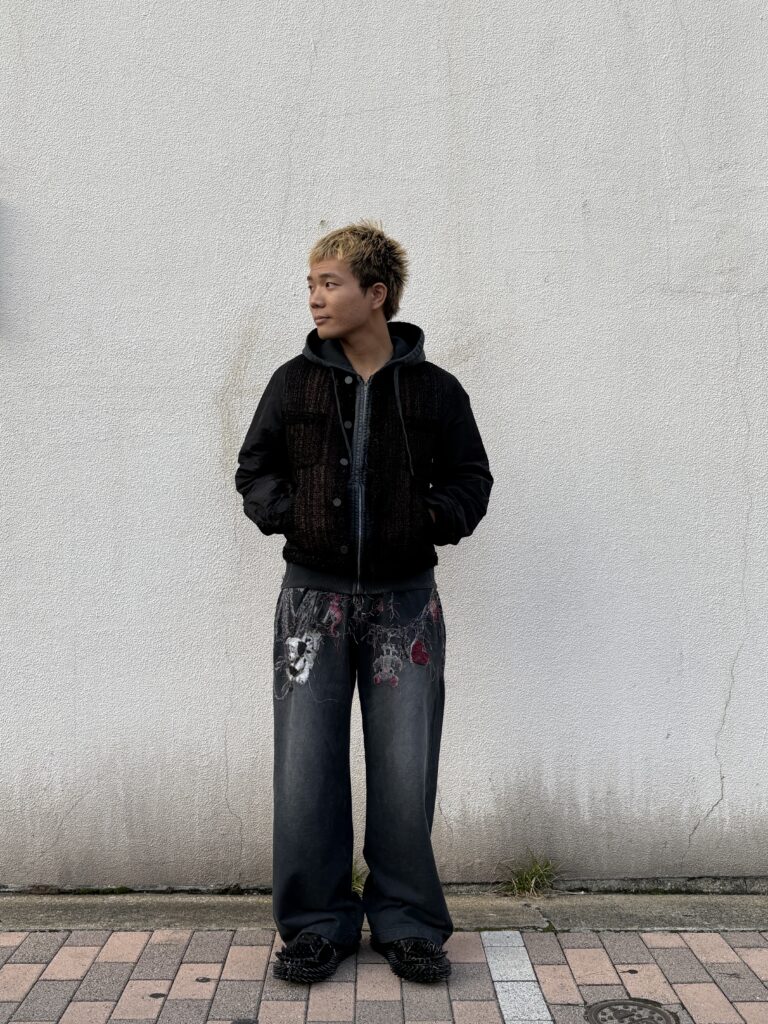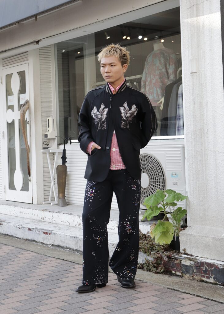 タイト目なトップスと組み合わせ、腰回りに施されたカオス刺繍を