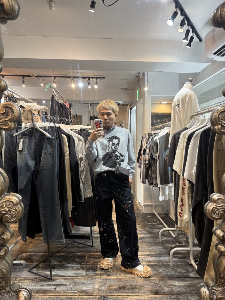 綺麗めシャツにスエットパンツとアンバランスに思えますが、