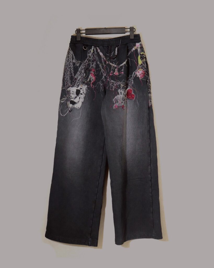 チェーンアクセサリーを腰に巻きつけたような刺繍を施したスウェットパンツ。