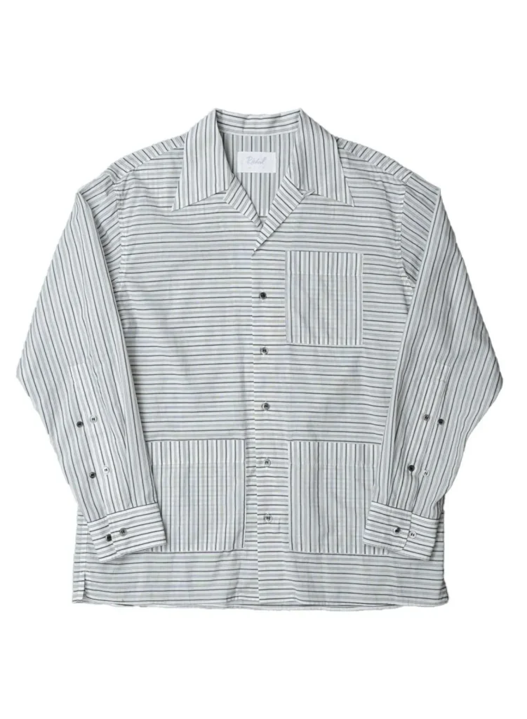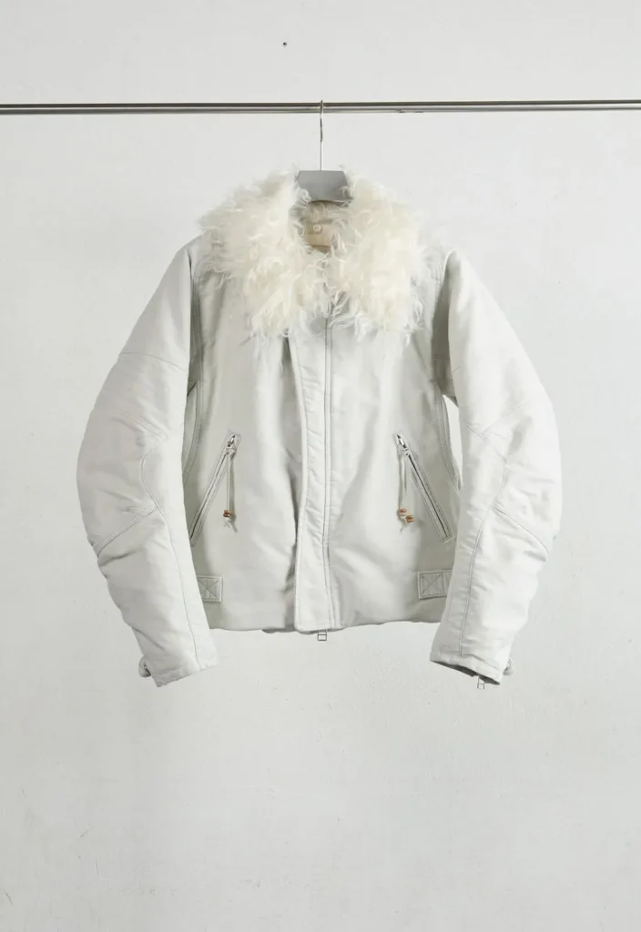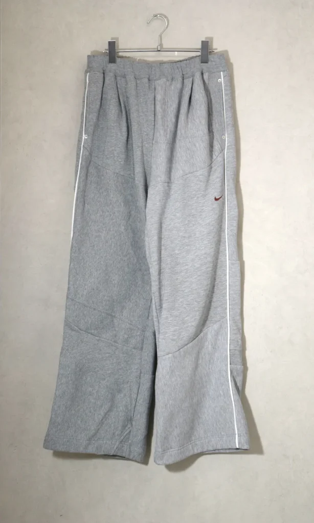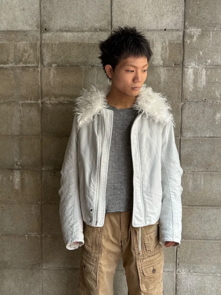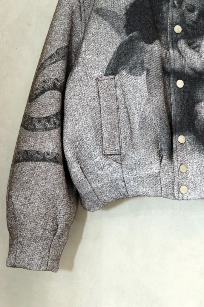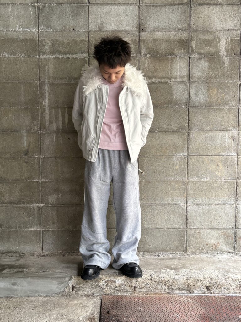 ムラ感のあるヘリンボーンのような表情豊かなグレー表地は2021FWコレクションで初めて発表されたポップコーントップスのポリエステルと、2024FWコレクションのスタジアムジャンパーに使われるメルトンをニードルパンチで接合したものです。