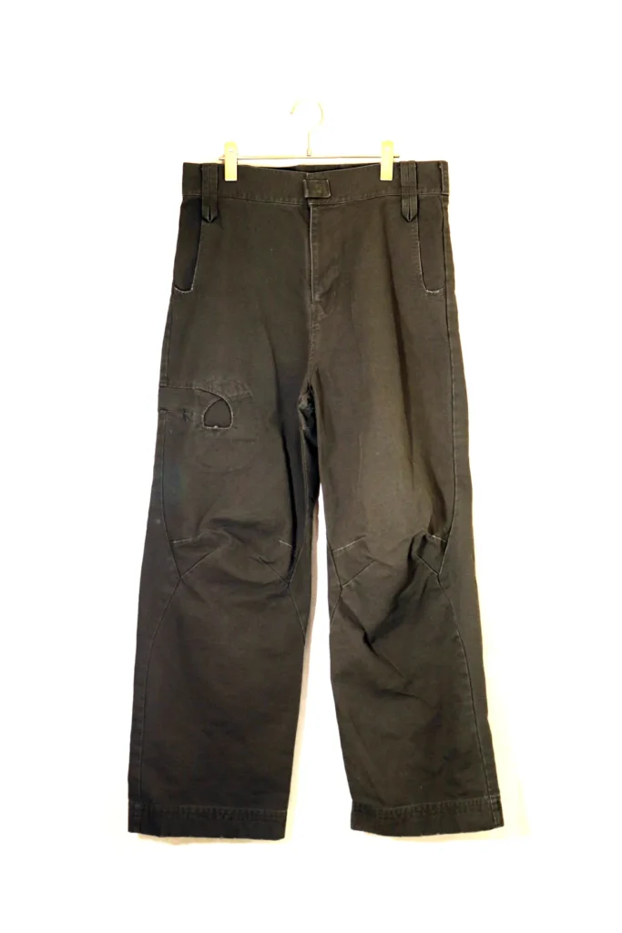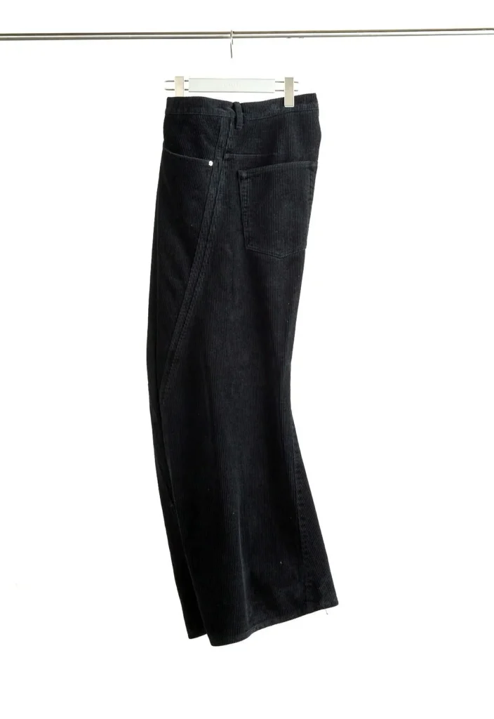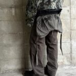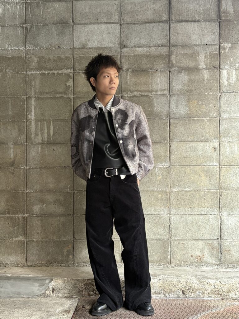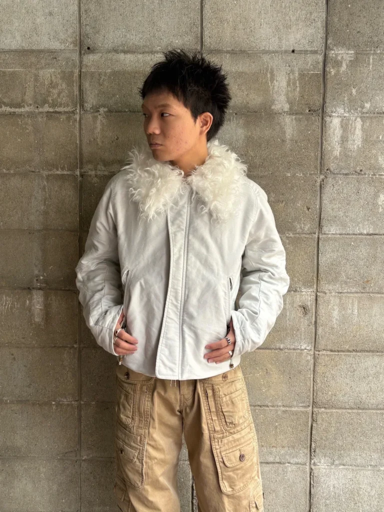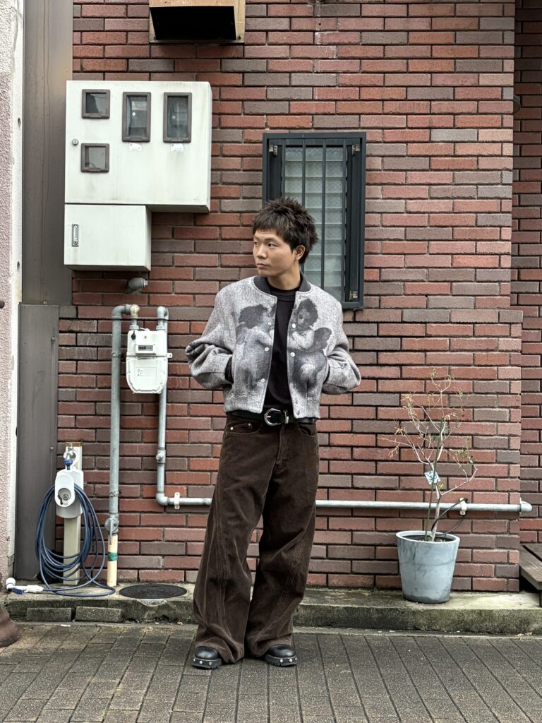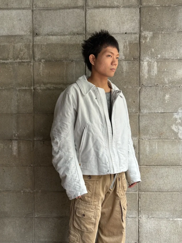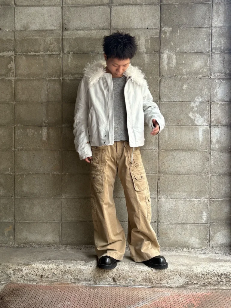 ショート丈のアイテムとなっているので、ワイドパンツのと相性がとても良いです。画像のようにパンツを少し落として履くことで、腰回りのベルトなどをジャケットの丈感を活かして見せることができます。