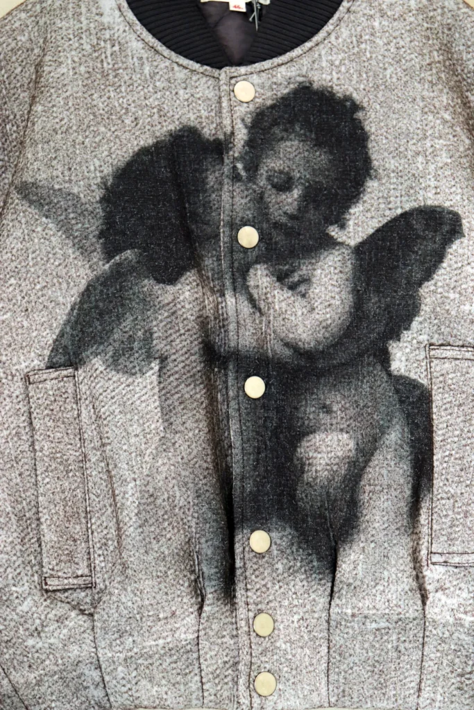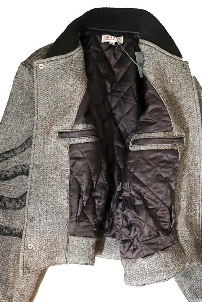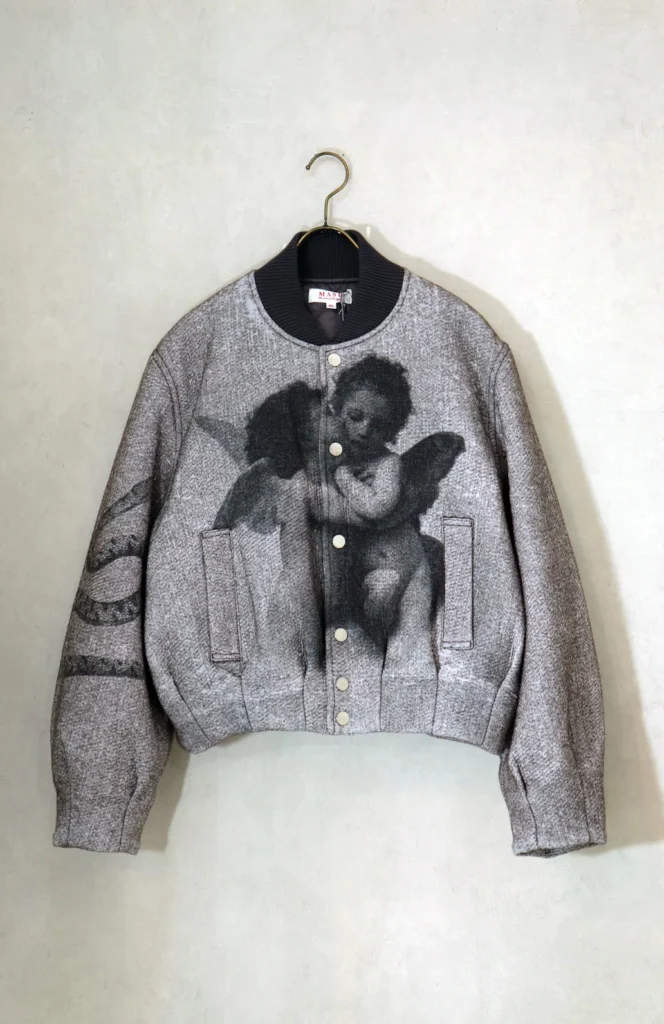 一点目はMASU ANGEL BOMBER JACKETになります。フロント中央に天使や、左袖から胸元へと流れるように配されたスネークモチーフなどエッジの効いたグラフィックが描かれたボンバージャケットなっております。