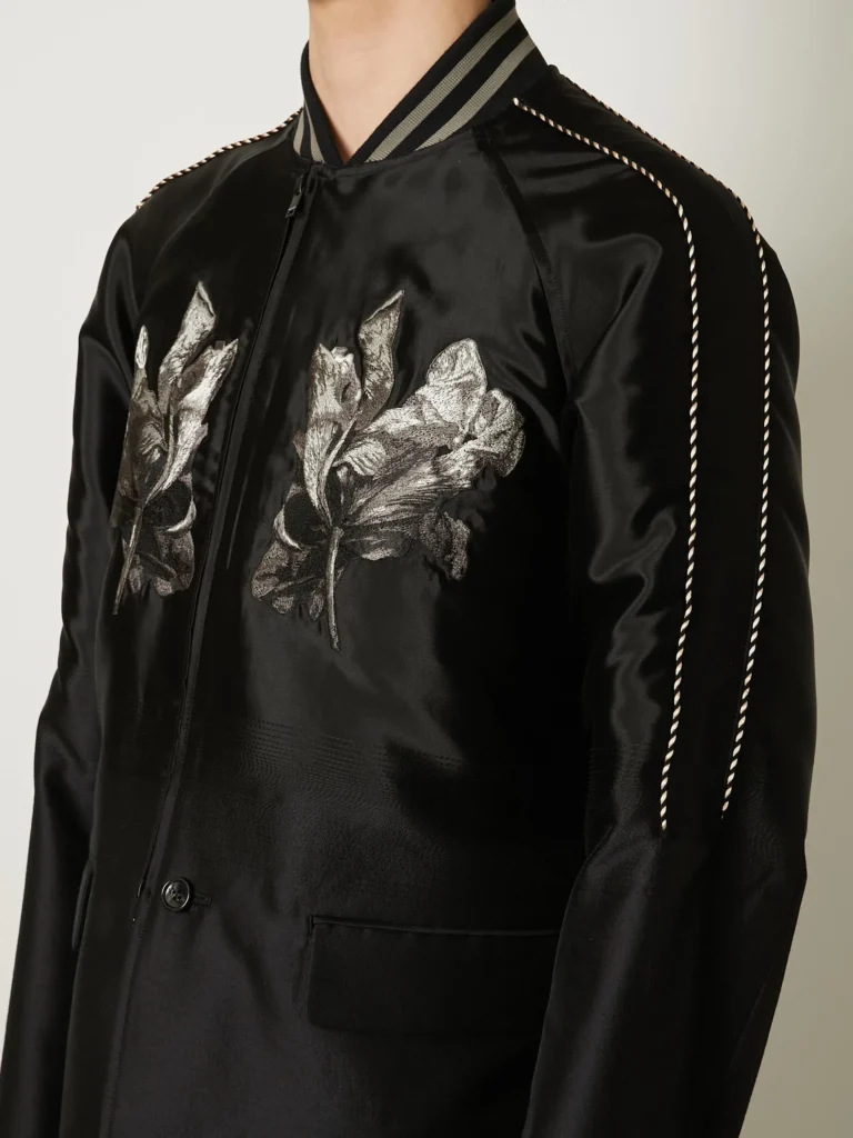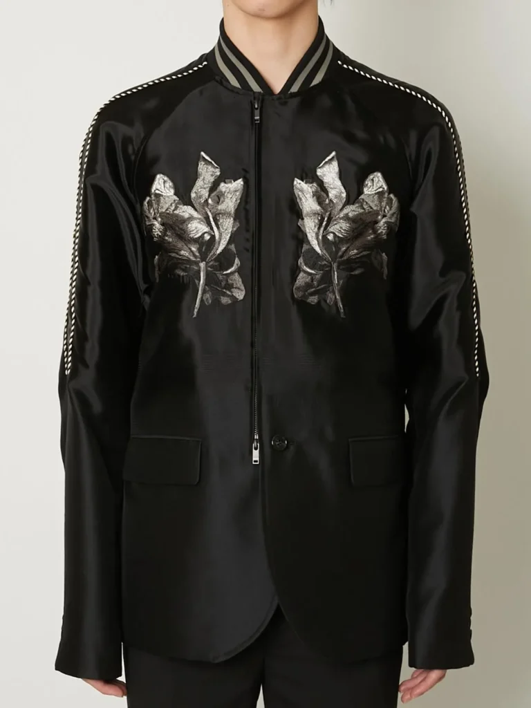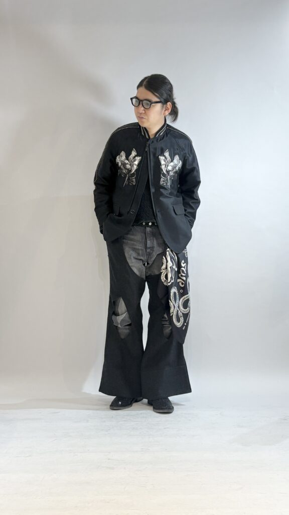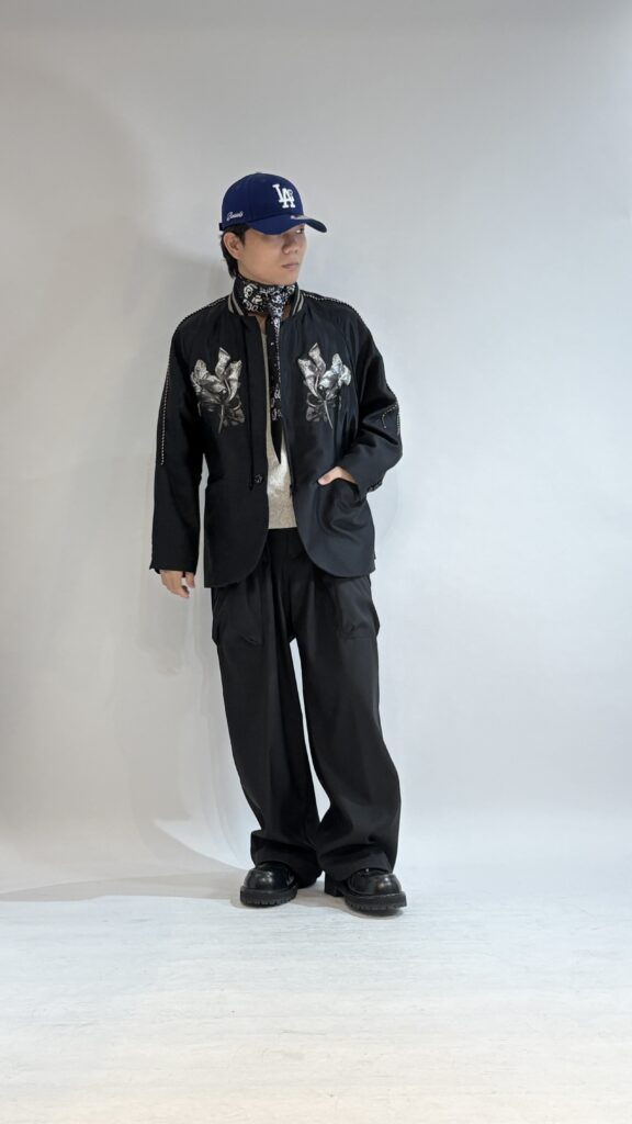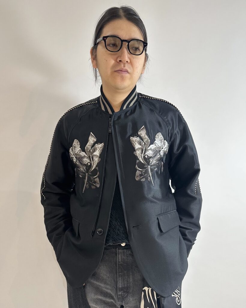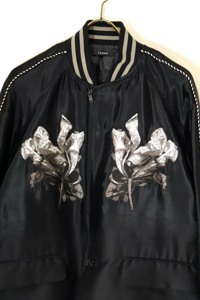 TAAKKの得意とする異素材のグラデーションが特徴であり、スーベニアジャケットのカジュアルさとテーラードジャケットの綺麗なシルエットをミックスした1着になります。