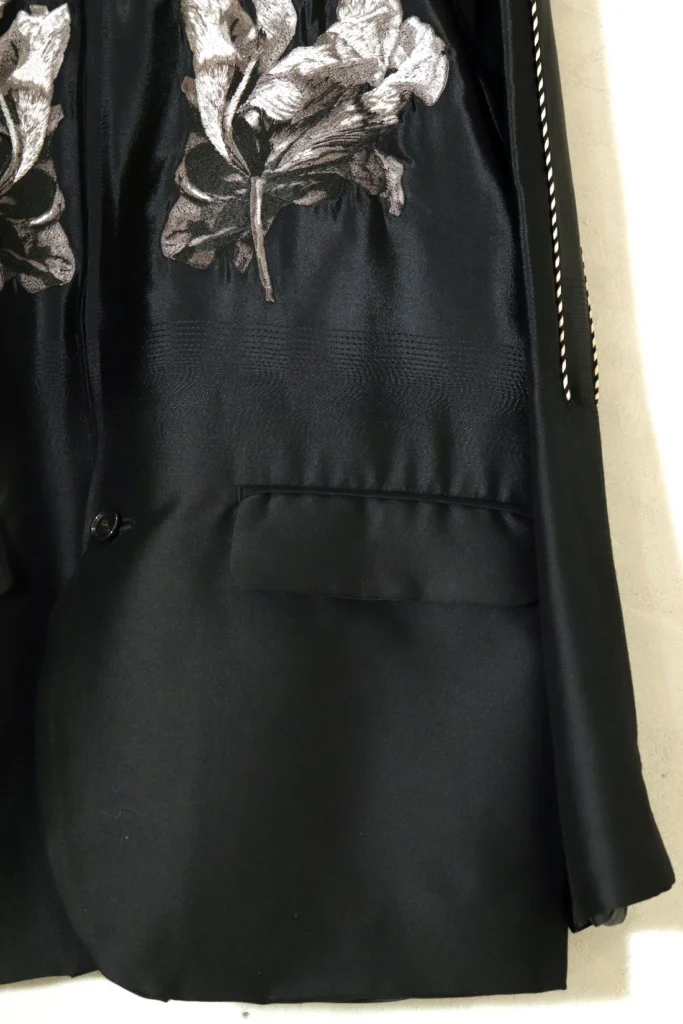 胸元に大きく配置されたフラワーモチーフは、シンプルなブラックの素材の中で強い存在感を放ち、シンプルな装いにアクセントを加えてくれます。