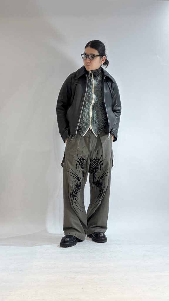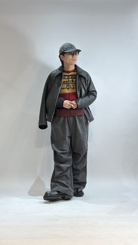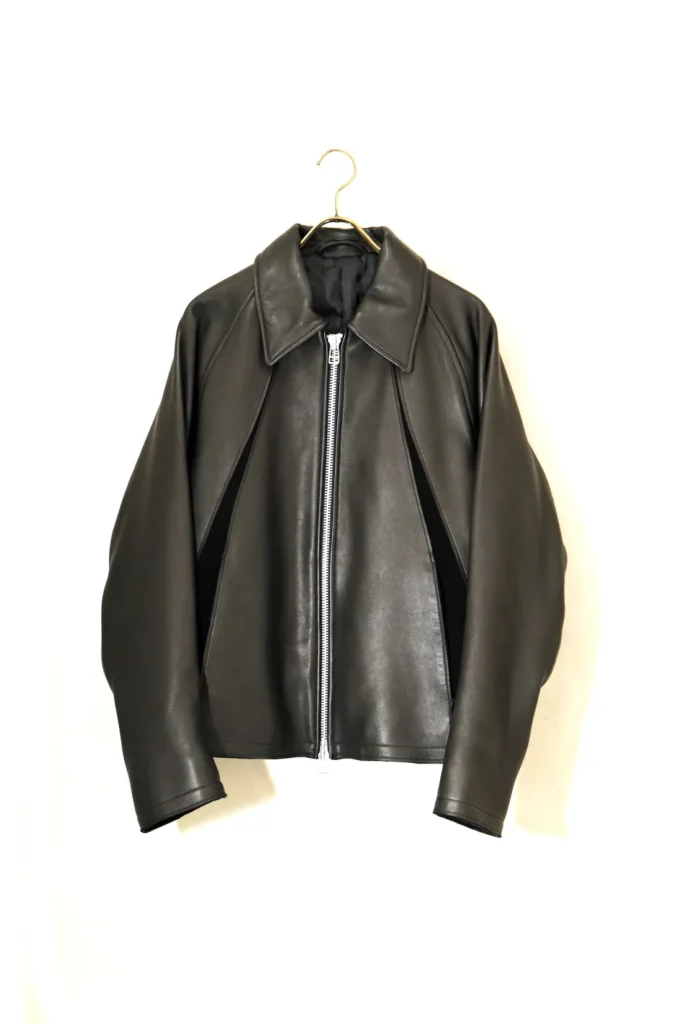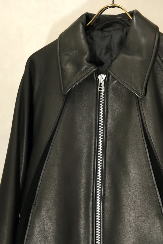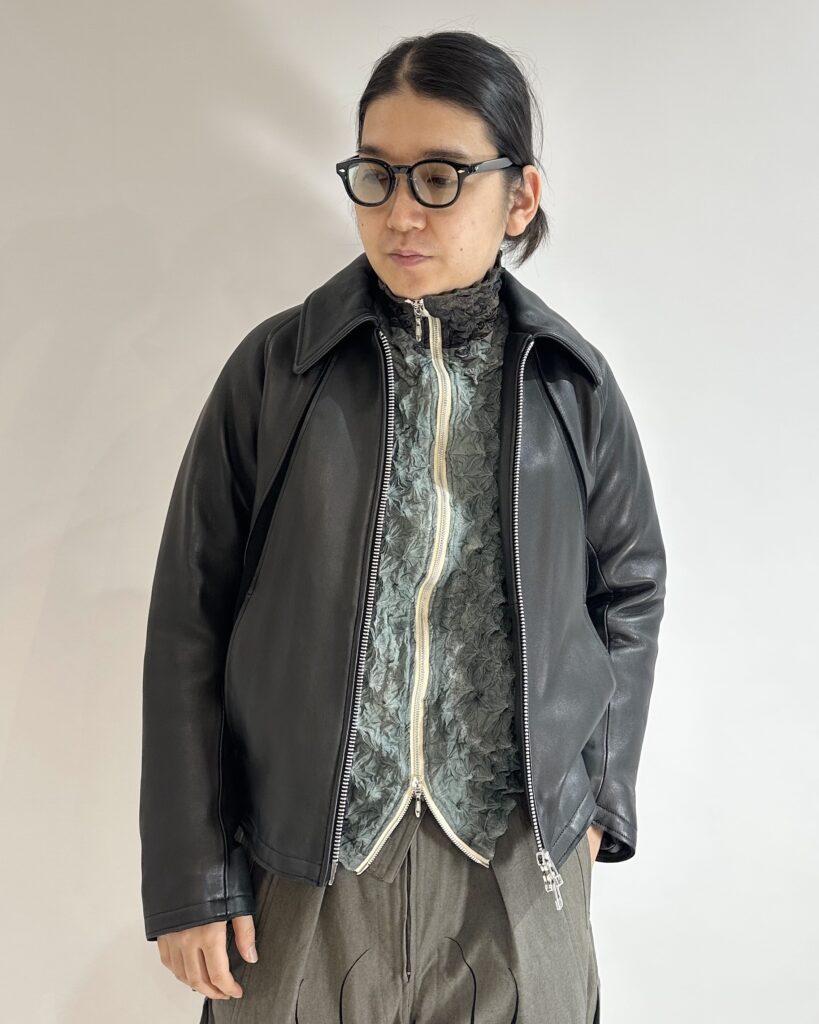 1点目はNVRFRGT LEATHER PANELED ZIP UP JACKETになります。25AWのNVRFRGTを代表するアイテムの一つであります。