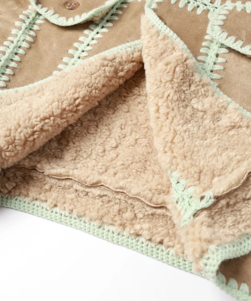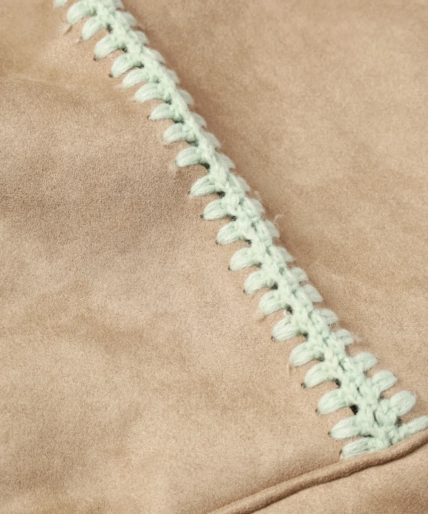 表地の素材はポリエステル100%となっており、滑らかなスエードのような風合いです。裏地にはボアのエコスエード生地を使用しているため保温性もしっかりとあり、表地との素材のコントラストが特徴です。