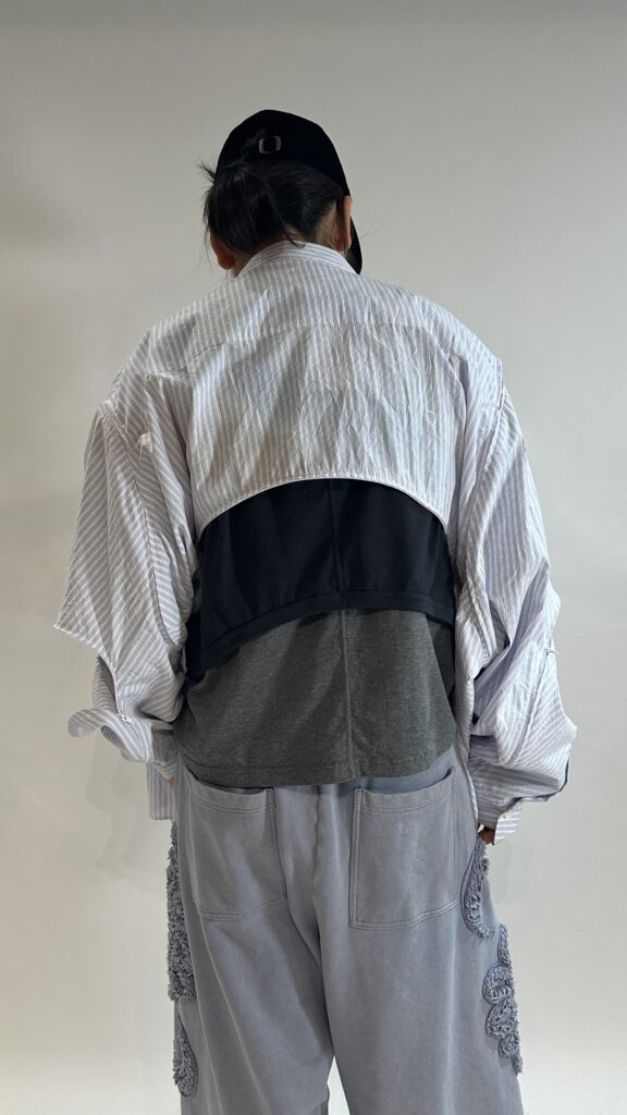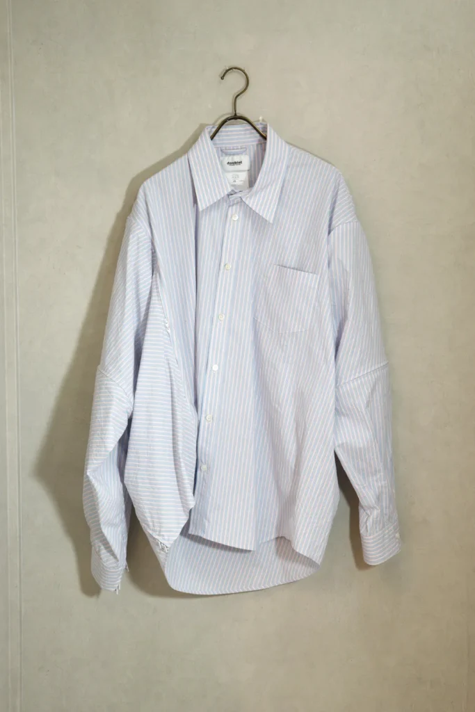 魚の“開き”をヒントに、Synfluxの技術で設計された1枚の平面パターンをシワ加工を施したストライプ生地で構成。
