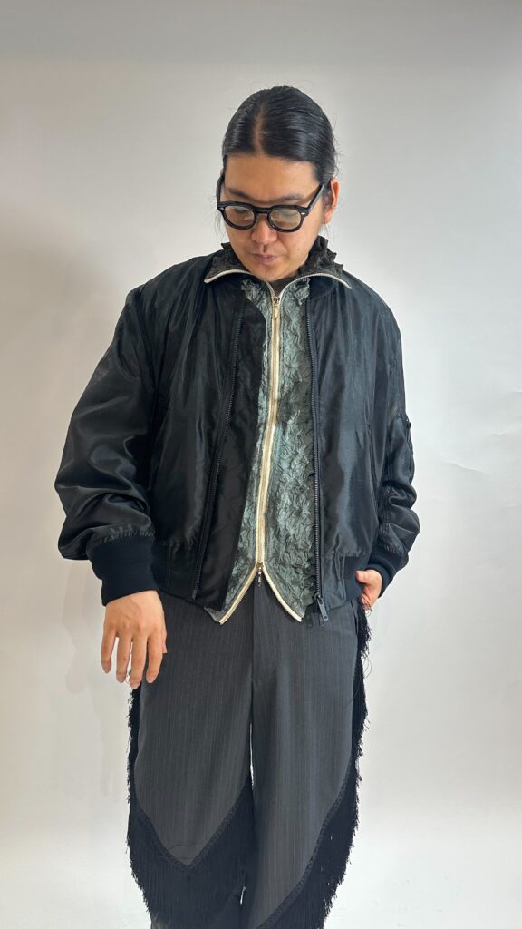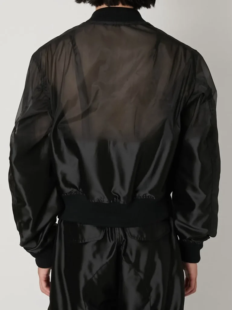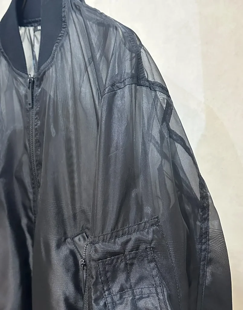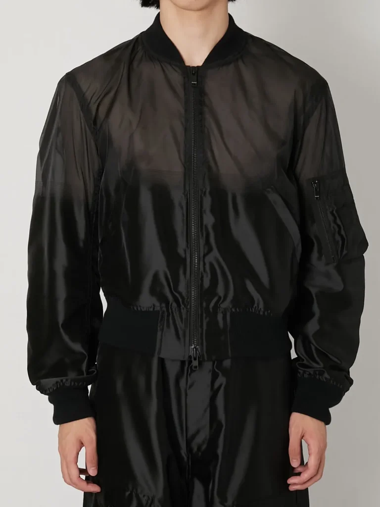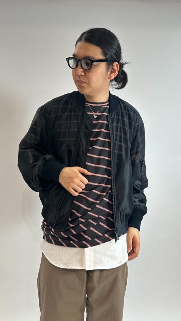 上に向かって徐々に透け感のあるシアー素材へと切り替わるTAAKKならではのMA-1ブルゾン。
