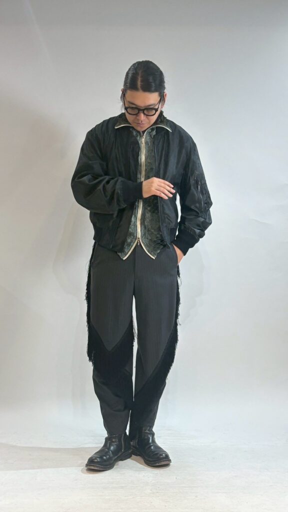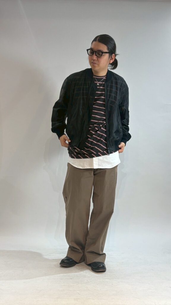 クラシックでチノパンぽい雰囲気もあるパンツなので同ブランドのフライトジャケットモチーフのスパイキージャケットを合わせてみました。