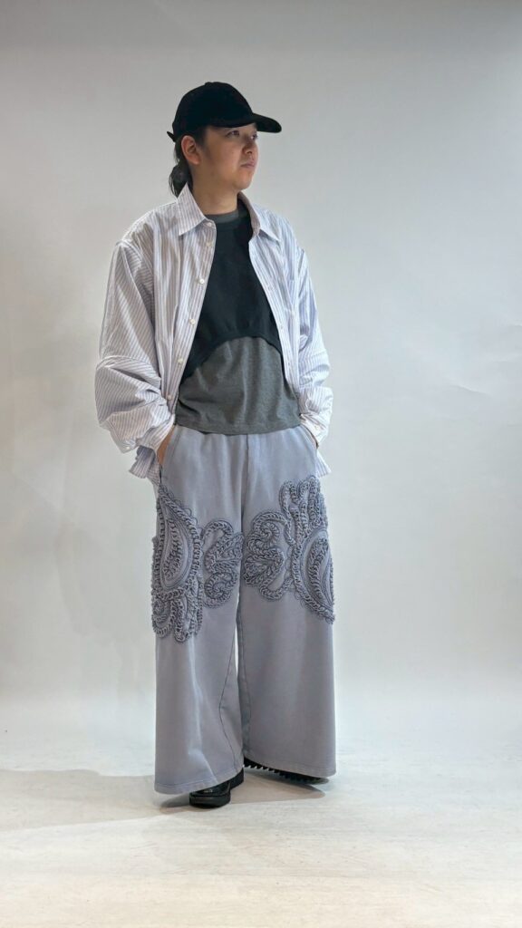 シャツはゆったりオーバーサイズなのでバランスよくパンツもワイド目のものをチョイス。シャツにスウェットで抜け感をプラス。