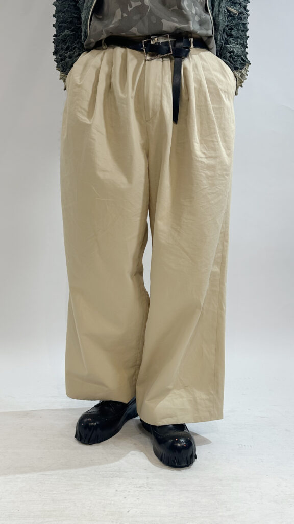 ウエスト周りの6タックとボリュームが特徴の一本。100%コットンのギャバジンを表地に使っているのでサラッと柔らかな肌触りでこれからの季節に最適の1本です。