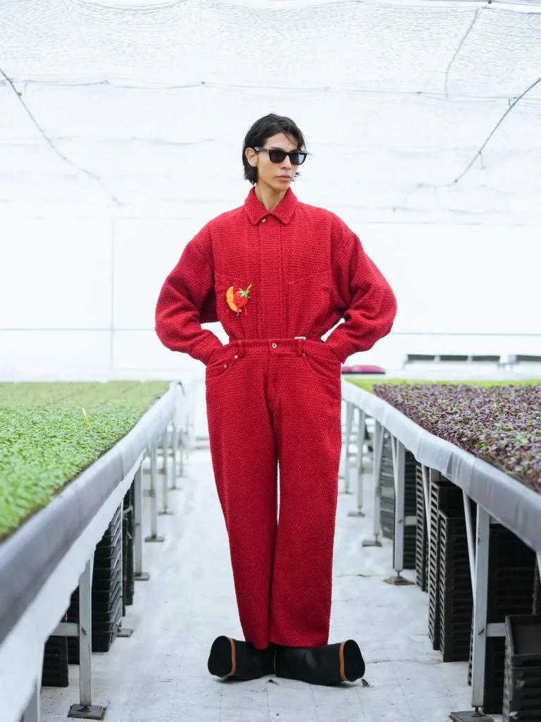 アメリカ・ニューヨーク州ハドソンバレーの非営利農場から誕生したブランドのSKY HIGH FARMとのコラボライテムとなっているため、手刺繍と手芸でつくられた立体的ないちごと月のワッペンが、
