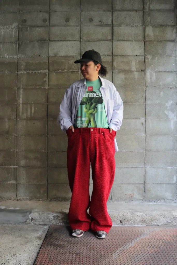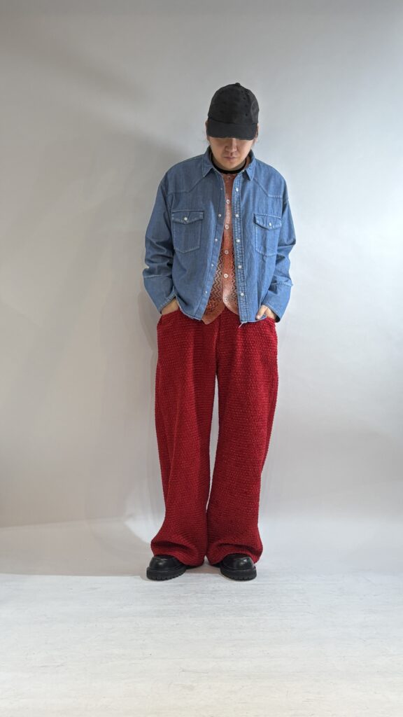 一見難しそうに見えるパンツですがトップスはデニムや白シャツ、またブラックなど幅広いトップスに合わせることができます。