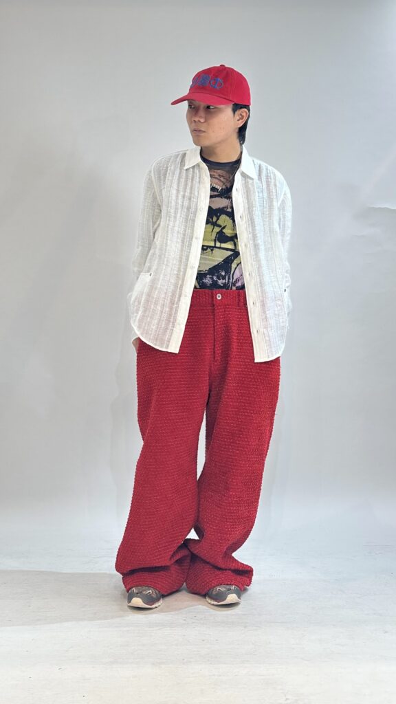 ベルトで折り返せばノーマルにも着用可能でしが、左の画像のようにタックインしていただくとより構造が際立ち、唯一無二のパンツとなります。二つの新しいパンツスタイルを楽しむことができる一本となっています。