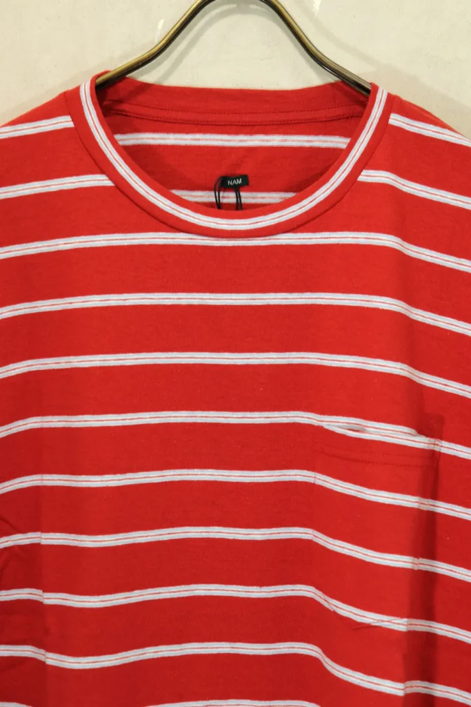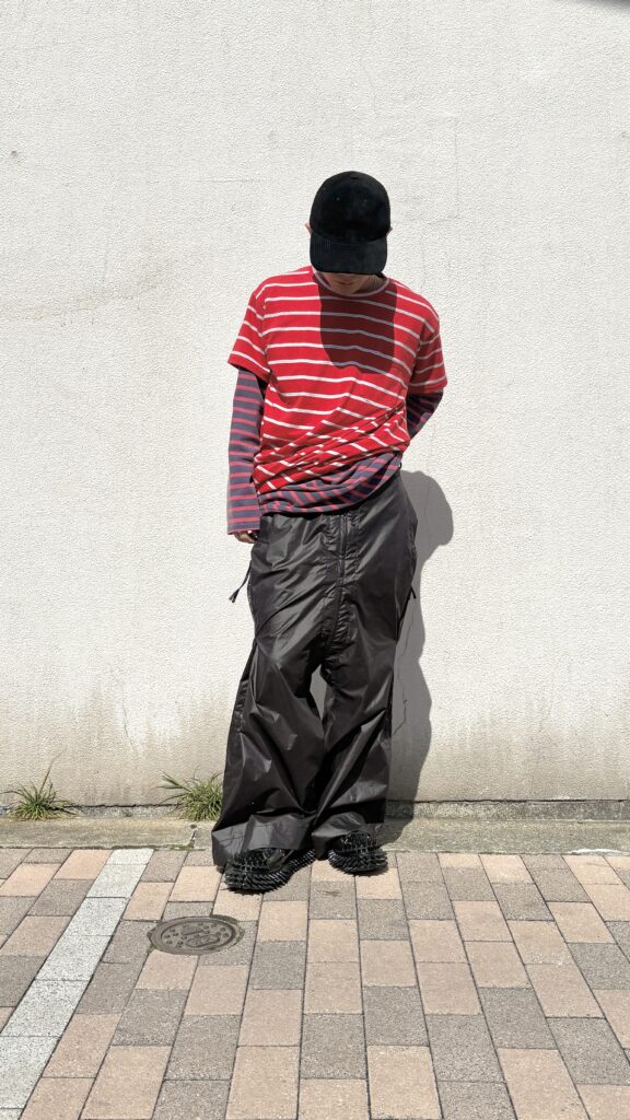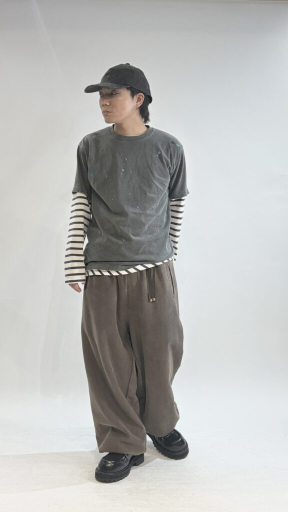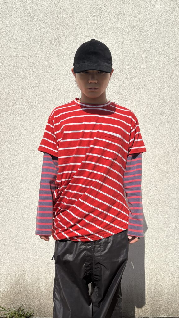 春先にTシャツとボーダーのレイヤードはいかがでしょう。裾からもレイヤードを楽しめる所がポイントです。
